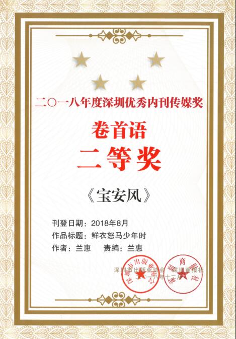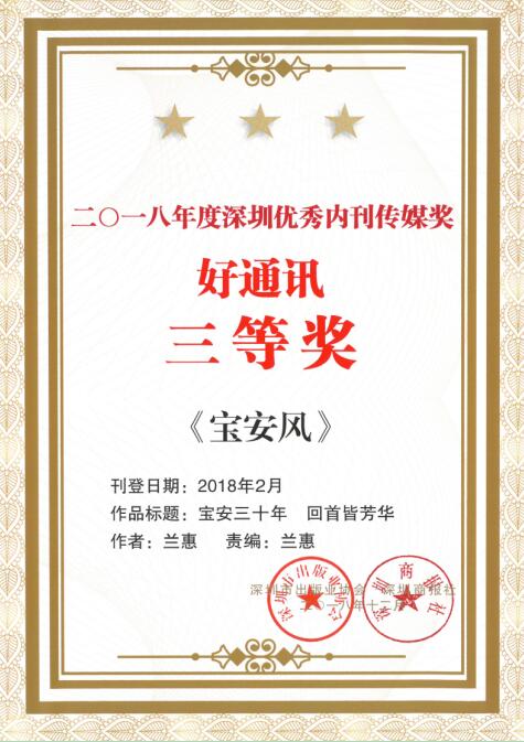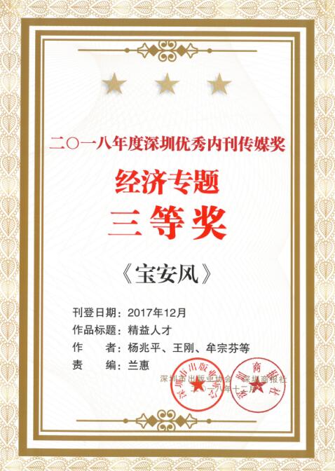 深圳内刊年度综合奖“优秀内刊传媒奖”,由市出版业协会、深圳商报联合组织深圳市新闻出版广电局等资深文化传媒专家评定,每年评选一次,代表着深圳内刊的最高荣誉。《半岛电子(中国)风》在强手林立的深圳内刊界再接再厉,再次获评“深圳优秀内刊传媒奖”之“十佳企业刊奖”。同时,282期“精益人才专题”获“经济专题”三等奖,286期卷首《鲜衣怒马少年时》获评“卷首语”二等奖,283期通讯“半岛电子(中国)三十年 回首皆芳华”获评“好通讯”三等奖。