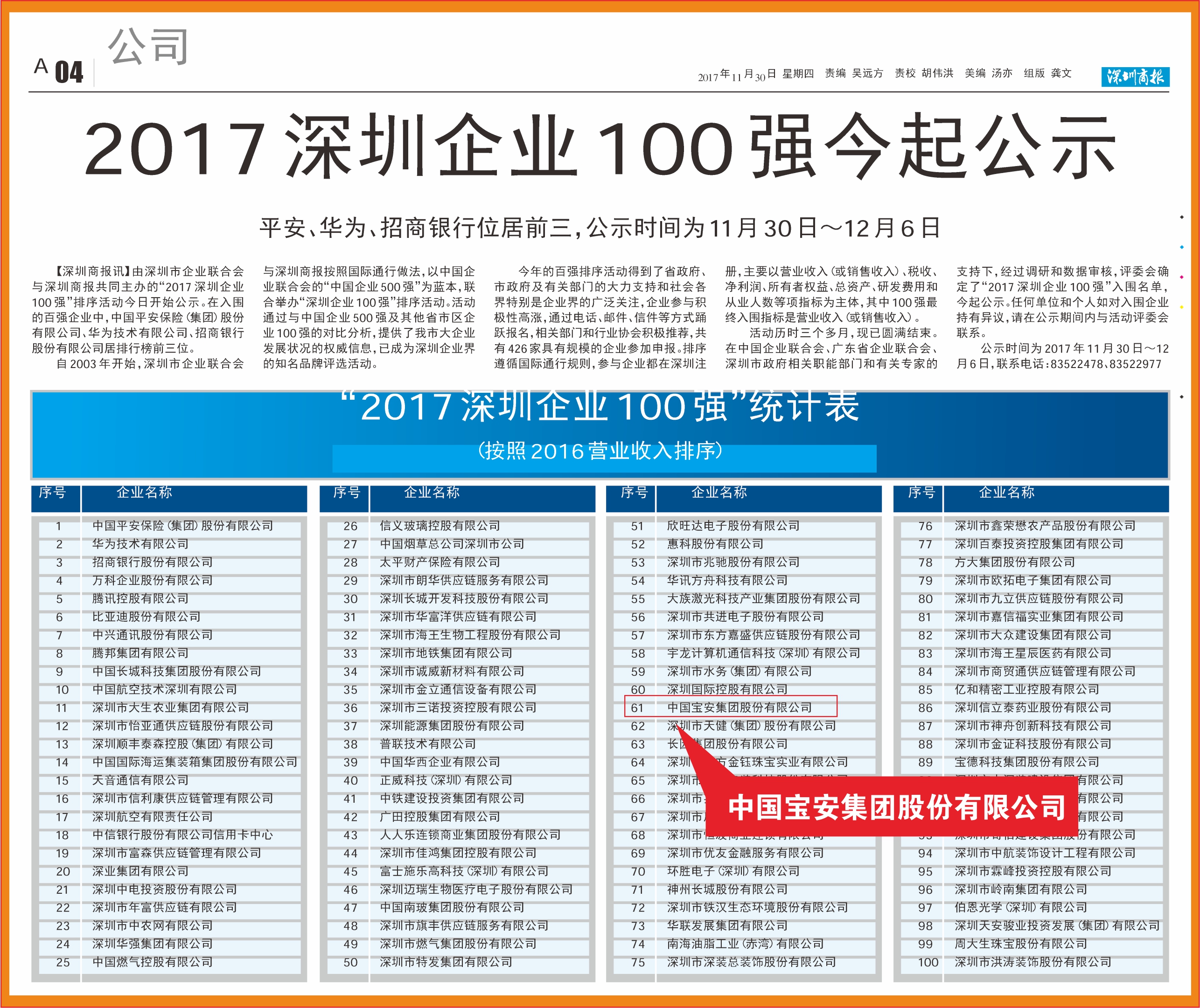 “2017 深圳企业100 强”入围名单,排序遵循国际通行规则,参与企业都在深圳注册,主要以营业收入(或销售收入)、税收、净利润、所有者权益、总资产、研发费用和从业人数等项指标为主体,其中100 强最终入围指标是营业收入(或销售收入)。在入围的百强企业中,中国平安保险(集团)股份有限公司、华为技术有限公司、招商银行股份有限公司居排行榜前三位。
